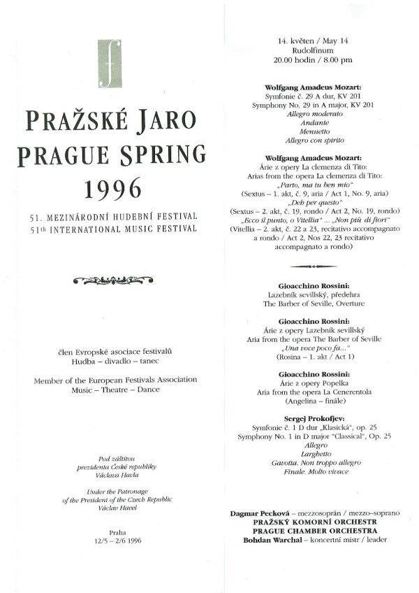 Jako koncertní mistr PKO Bohdan Warchal poprvé vystoupil 4. února 1996 v Rudolfinu. Koncert zahájil soudobou českou skladbou Concerto grosso III. Zdeňka Lukáše z roku 1977, původně zkomponovanou právě pro PKO. Na programu byla i Třetí symfonie Franze Schuberta, jejíž provedení se setkalo s nevídaným ohlasem, stejně jako celý koncert: „V závěrečné Schubertově 3. symfonii strhl záviděníhodně vitální Warchal orchestr k vrcholnému výkonu s bezchybnou intonací a ideálním zvukovým propojením smyčcového a dechového bloku. Ne každý orchestr je s to přesvědčivě zakončit koncert juveniliem osmnáctiletého skladatele. PKO se to podařilo a zasloužený úspěch korunoval brilantním přídavkem.“ Vít Roubíček, Harmonie 3/1996.