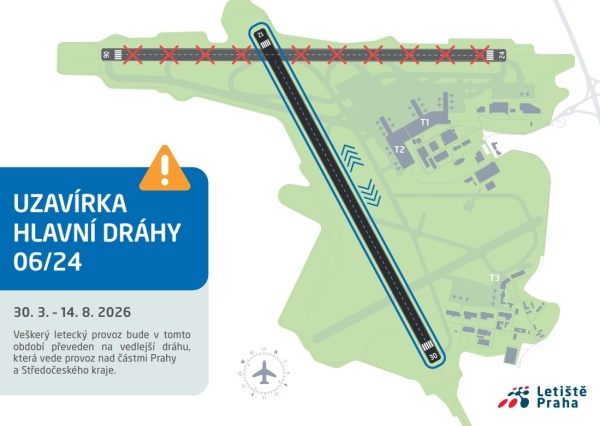V pondělí 30. března 2026 bude zahájena druhá etapa uzavírky hlavní dráhy 06/24, která potrvá 4,5 měsíce. Stejně jako v loňském roce dojde v okolí hlavní dráhy k nutným stavebním a technologickým pracím, které mají za cíl udržet dráhu ve standardech požadovaných předpisy a zvýšit provozní bezpečnost a spolehlivost. Veškerý provoz letadel bude po dobu uzavírky hlavní dráhy převeden na vedlejší dráhu 12/30, která svými příletovými a odletovými směry vede letadla nad hustě osídlenými částmi Prahy a Středočeského kraje, Letiště Praha do výstavby paralelní dráhy však nemá jinou možnost. Uzavírku využije také společnost Pražská plynárenská, Ředitelství silnic a dálnic a Řízení letového provozu ČR.
