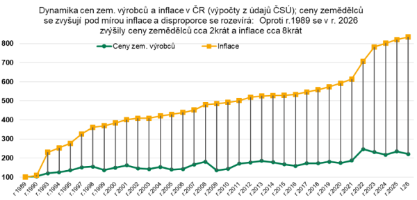 Dlouhodobá data zároveň ukazují, že ceny zemědělských výrobců rostou výrazně pomaleji než celková inflace. Od roku 1989 se zvýšily přibližně dvakrát, zatímco celková cenová hladina vzrostla zhruba osmkrát. Zemědělství tak dlouhodobě působí jako stabilizační a protiinflační prvek ekonomiky.