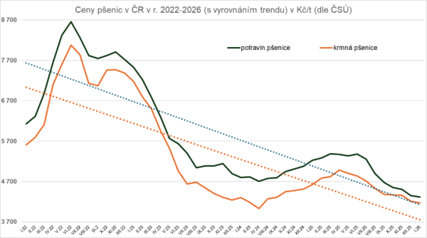 Dlouhodobý cenový tlak dokládá i vývoj u jednotlivých komodit. Potravinářská pšenice se aktuálně prodává přibližně za 4 319 Kč za tunu, což je méně než v roce 2008, krmný ječmen kolem 3 715 Kč za tunu (pod úrovní roku 2012) a ceny brambor zhruba 5 100 Kč za tunu odpovídají přibližně úrovni z roku 2004.