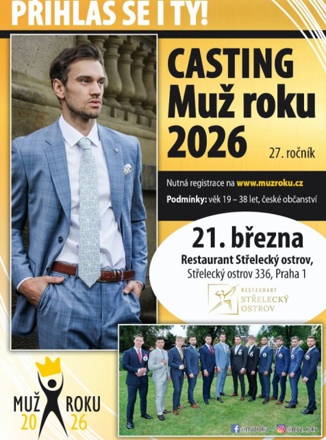 Přihlaste na casting soutěže Muž roku. Registrace je možná na www.muzroku.cz. První kolo castingu proběhne 21. března 2026 a druhé 25. dubna 2026.