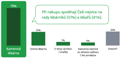 Lékárny zaujímají dominantní pozici, v průměru 68 % Čechů nakupuje probiotika v kamenné nebo online lékárně.
