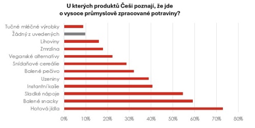 Z dat Barometru FOOD vyplývá, že Češi si ultrazpracované potraviny nejčastěji spojují s instantní kuchyní. Za vysoce průmyslově zpracované potraviny považuje 73 % lidí hotová jídla, jako jsou např. mražené pizzy nebo instantní polévky, 59 % balené snacky a 55 % slazené nápoje. Naopak výrazně méně respondentů si tuto kategorii spojuje s produkty, které bývají běžnou součástí každodenního jídelníčku – například s baleným pečivem (32 %), snídaňovými cereáliemi a müsli tyčinkami (29 %) nebo některými mléčnými výrobky (9 %). Data tak ukazují, že lidé hůře rozpoznávají míru zpracování u potravin, které se často prezentují jako zdravé či dokonce dietní.