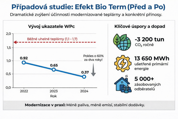 Teplárna s elektrickým výkonem 6,658 megawattu a tepelným výkonem 10,988 megawattu zásobuje více než pět tisíc odběratelů prostřednictvím sítě o délce 6,7 kilometru. Zásadní je však vývoj její energetické účinnosti. Ukazatel WPc, který vyjadřuje množství neobnovitelné primární energie potřebné k výrobě jedné jednotky tepla, klesl v Bio Term z hodnoty 0,9204 v roce 2022 na 0,6475 v roce 2023 a dále až na 0,3733 v roce 2024 . Pro srovnání, běžné uhelné nebo starší plynové teplárny se pohybují v rozmezí 1,1 až 1,7 , tedy vykazují až čtyřnásobně vyšší spotřebu neobnovitelné primární energie na jednotku dodaného tepla. „Ukazuje se, že energetická transformace není ideologická debata, ale měřitelný technický proces. Moderní kogenerace se stávají páteří transformace proto, že přinášejí konkrétní čísla: nižší spotřebu paliva, nižší emise a stabilní dodávky,“ říká Pacovský.