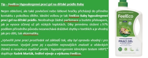 Vždy raději volte výrobky bez parfemací, jako je řada FeelEco Baby. Její složení bez parfému a problematických konzervantů je zvoleno s ohledem na maximální šetrnost k dětské pokožce. Řada je navržena tak, aby vyhovovala i těm nejcitlivějším: ekzematikům, alergikům a jedincům s citlivou pokožkou. Nezapomínejte také, že pokožka dítěte je v neustálém kontaktu s oblečením nebo ložním prádlem, takže byste měli velký důraz klást také na výběr vhodných pracích prostředků. Prací gel a Odstraňovač skvrn Baby úspěšně získaly hypoalergenní klinický test HRIPT.