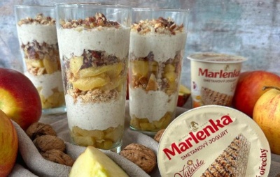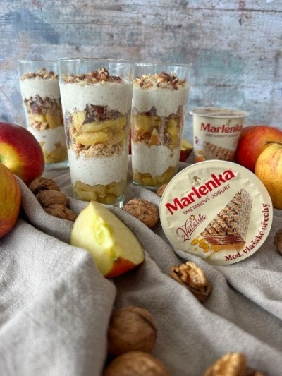 Spojením lahodného smetanového jogurtu z Valašska Mlékárny Valašské Meziříčí s legendárním medovým dortem Marlenka z podhůří Beskyd, vznikl jedinečný poctivý jogurt s chutí medového těsta a pražených oříšků. Oblibu mezi zákazníky si našel okamžitě. Smetanový jogurt z Valašska s příchutí Marlenky se vyrábí ve dvou variantách, a to klasické a s kakaem. Základ je ale stejný – kvalitní smetana, kterou odebírá Mlékárna Valašské Meziříčí od moravských farmářů a nezaměnitelná chuť medového dortu od Marlenky. A protože oslava jara v podobě Velikonoc by měla být veselá a hravá, připravila Mlékárna Valašské Meziříčí dva recepty, díky kterým uctíte každou návštěvu. A to Jablečné poháry se Smetanovým jogurtem Marlenka a Tiramisu s jogurtem Marlenka. Veselé a hravé Velikonoce Vám přeje Mlékárna Valašské Meziříčí.