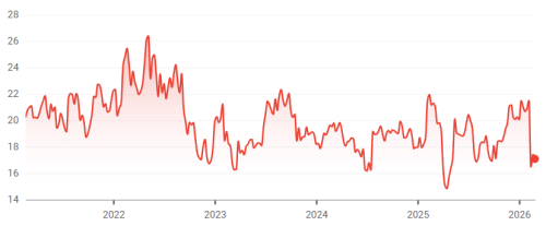 Vývoj cen akcií společnosti Mattel za posledních 5 let.* Zdroj: Google Finance