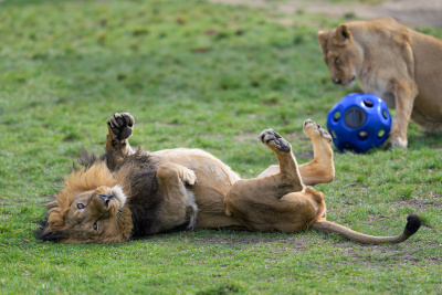 Lvi indičtí dostávají v těchto dnech nové enrichmentové prvky. Ovoněné míče plněné masem je zabaví na dlouhé chvíle. Foto Petr Hamerník, Zoo Praha