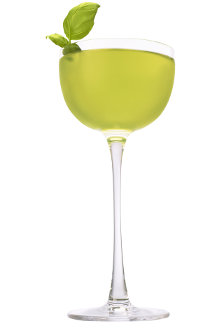 Bazalkové lístky jemně rozmačkejte, přidejte všechny ingredience do šejkru s ledem a protřepte. Přeceďte přes dvojité sítko do vychlazené skleničky a ozdobte plovoucím čerstvým lístkem bazalky.