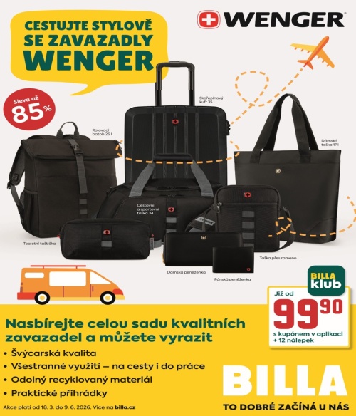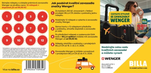 Za každých 250 Kč utracených v prodejnách BILLA získají zákazníci jednu nálepku. Po nasbírání 12 nálepek mohou členové BILLA klubu pořídit vybraný produkt Wenger za výrazně zvýhodněnou cenu od 99,90 Kč. Stačí předložit a naskenovat EAN kód v aplikaci BILLA klub. Nálepky lze sbírat od 18. března do 2. června 2026, zavazadla je možné vyzvednout až do 9. června 2026.
