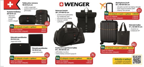 Značka Wenger je synonymem precizního zpracování a promyšlených detailů. V kampani je připravena široká nabídka zavazadel a doplňků, které se hodí nejen na cesty, do práce či školy, ale i na sport a nákup. Zákazníci si mohou vybrat například skořepinový cestovní kufr se čtyřmi otočnými kolečky vhodný do kabiny letadla i na víkendové výlety, moderní rolovací batoh pro každodenní nošení, elegantní dámskou kabelku, prostornou cestovní a sportovní tašku nebo lehkou variantu přes rameno. Součástí kolekce je také praktická toaletní taštička nebo stylové dámské i pánské peněženky z veganské kůže.