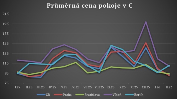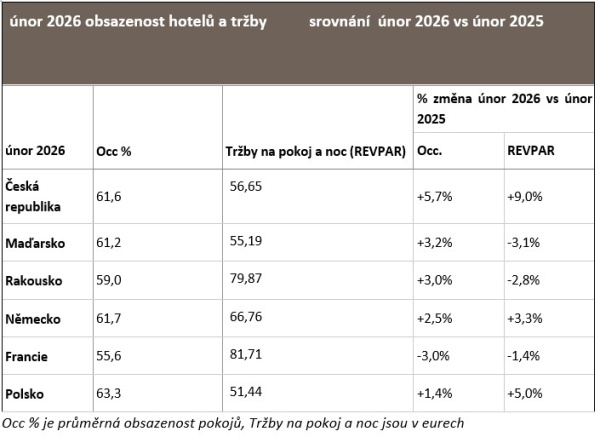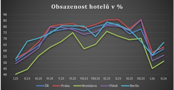 Proběhlý únor přinesl pozitivní zprávy pro hotelový trh a devítiprocentní meziroční růst pro Českou republiku. Ukázal drobné ochlazení našeho skvělého lednového vývoje, ale pokračující skvělý trend, který Česká republika zaznamenala v posledních měsících uplynulého roku. To kontrastuje s dlouhodobou stagnací či poklesem „hotelových“ velkých zemí (Francie, Rakousko) a obecně zeměmi Západu.