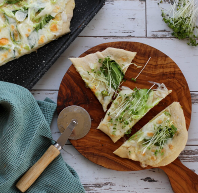 Jaro už je nepopiratelně tady, ať už se řídíte podle počasí nebo podle kalendáře. Toto období máme spojené s novou energií, lehkostí a chutí na změny všeho druhu, což se velmi často odráží právě na našem talíři. Po zimních měsících plných hutnějších jídel začínáme vědomě i nevědomě sahat po svěžích surovinách, barvách a chutích, které nám dodají pocit zaslouženého jarního restartu. Právě proto přinášíme recept na jarní flatbread, který si můžete upravit přesně podle sebe a podle toho, co máte zrovna doma. Je skvělým základem pro kreativní obložení – ať už sáhnete po jarní cibulce, pak choi nebo po cuketě, jistě neuděláte chybu. Cuketa navíc obsahuje vysoké množství vody, díky čemuž je lehce stravitelná a ideální do jarního jídelníčku. Je bohatá na vlákninu, která podporuje trávení, a zároveň dodá tělu vitamín C, draslík a antioxidanty. Díky nízké energetické hodnotě se skvěle hodí i do odlehčených receptů, které zasytí, ale nezatíží[1]. A přesně takovým receptem je i tento jarní flatbread z bio mouky. Vyzkoušejte si jej proto s námi!