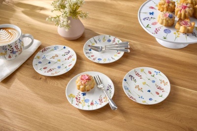 Talířky s drobným motivem jarních kvítků podpoří radostnou jarní náladu. Čtyřdílná porcelánová sada je ideální na dezerty i menší pohoštění, kdy jemné květinové vzory krásně podtrhnou každý servírovaný kousek. Talířky mají průměr přibližně 15,5 cm, jsou vhodné do myčky a skvěle se hodí k jarním oslavám i k běžnému domácímu stolování.