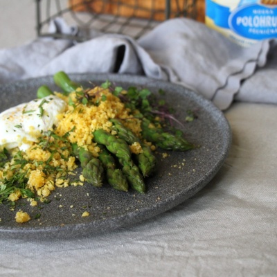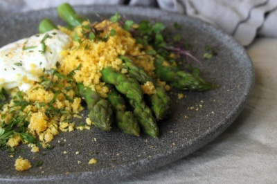 Směs na krustu orestujte na pánvi na troše másla do křupava. Na konec do směsi vmíchejte parmazán, ale už teplotně neupravujte, sýr se propojí se strouhankou. Servírujte chřest posypaný krustou se zastřeným vejcem a bylinkami.