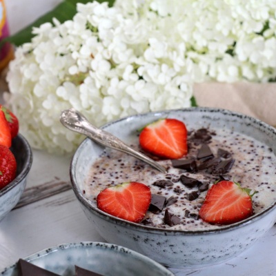 Odstavte kaši z plamene a přidejte na kusy nasekanou čokoládu, lehce promíchejte. Zdobte kokosovými lupínky, čerstvými jahodami a čokoládovými hoblinkami.