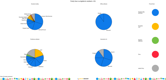 „O těchto rizicích se v Česku moc nemluví. Často se u nás řeší energetická bezpečnost, při které si neumíme představit, že by české elektrárny vlastnila cizí mocnost. Vůbec ale nemluvíme o tom, že nevlastníme platební systémy a většinu cloudových serverů – a že USA je teoreticky může vypnout,“ komentuje analytik Evropy v datech Adam Trunečka.