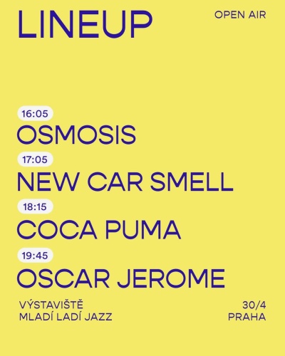 Do Prahy dorazí také italská producentka a zpěvačka Coca Puma, která zaujala svou snovou kombinací elektroniky, nu-jazzu a dream popu. Její hudba, vznikající mezi Římem a krajinou v údolí Treja, vytváří jemný, atmosférický zvukový svět. Výrazný kontrast přinese britské trio New Car Smell, které samo sebe označuje jako „punkovou kapelu převlečenou za dechovku“ a kombinuje rychlost drum and bassu s energií rocku a groove funku.