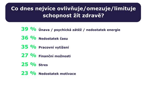 Průzkum ukázal, že Češi chtějí žít zdravěji. Často ale narážejí na pracovní tempo a každodenní vytížení. Nejčastější překážkou je pro ně totiž únava a psychická zátěž, které uvádí 39 % respondentů. Těsně za nimi následuje nedostatek času (36 %) a pracovní vytížení (35 %). Zdravý životní styl se tak odsouvá na druhou kolej a lidé se mu věnují až ve chvíli, když jim na něj zbývá energie.
